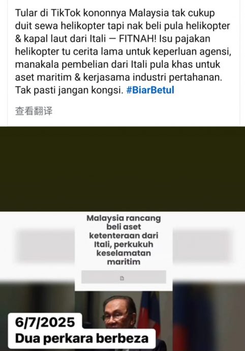 Biar Betul脸书公共主页日前在脸书发文,指社交媒体上流传我国已穷得没钱租直升机,但又要向意大利购买直升机及船舰的消息不实。