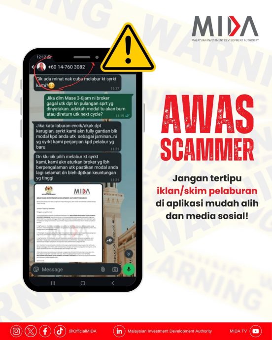 MIDA通过脸书贴文提醒公众,诈骗诈骗手法日益猖獗,诈骗集团目前已通过WhatsApp 等手机应用程式和社交媒体,冒充MIDA的代表推广可疑的投资计划。