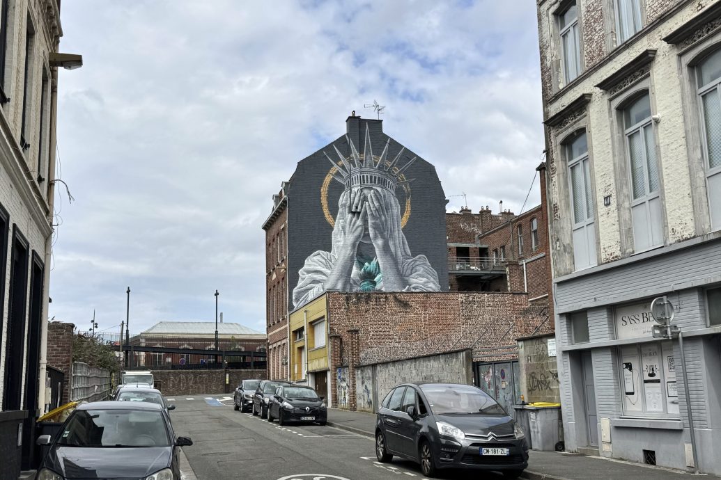 这幅位于鲁贝、面积500平方米的壁画,展示自由女神以双手遮眼,象征对当前移民处境的悲叹。朱迪思在脸书发文表示:“这是对自由应有之义的静默提醒。对移民以及被边缘化、沉默或隐形的人群而言,自由遥不可及。我画她蒙住双眼,因为世界的重担已让她无法直视。曾是自由光辉象征的雕像,如今承载意义丧失的悲哀。”
