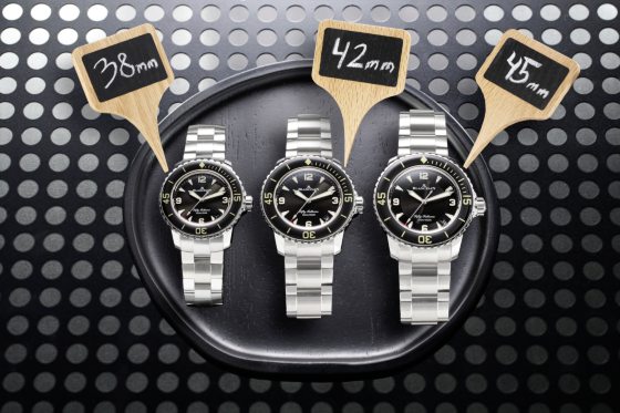 Blancpain Fifty Fathoms五十噚系列潜水自动腕表,38、42及45毫米3个不同尺寸表款的大小比例。