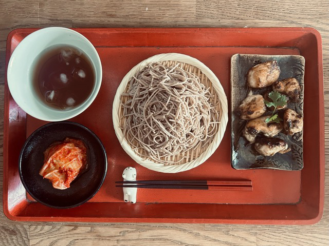 翻出厨房架子上那罐半包剩下的十割荞麦面,干脆改煮面吧。这种天气适合吃冷荞麦面,搭配酱油、味醂和高汤调的蘸酱。鸡胸肉则换成唐扬炸鸡的做法,再加上一小碟韩国泡菜。如此就完成了我的午餐。
