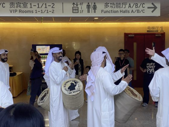 阿联酋展台扼守着展区大门,人来人往不说,还时不时载歌载舞。旁边的日本展台总被声浪吞没,交流业务一度得咬耳朵,像在讲闲话。“阿联酋人天天跳舞吧?”我问了一句。保安人员默默点头。