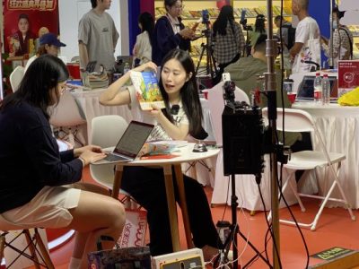 稍微逛一圈,我就发现神情专注、口若悬河的直播卖书人员。她们对着手机大力推荐手头的绘本,声情并茂,同事在一旁的电脑上管理后台。不远处还有几对搭档做着同样的业务,只不过推销的童书不一样罢了。