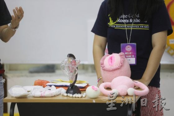 课室中央桌上摆放各式物品,从保暖袋、卫生棉、卫生棉条,到子宫、阴道的玩偶模型,配备齐全。月经卫生展示物是DaYiMa Project工作坊的“得力助手”,协助学生跳脱荧幕,透过与实物互动学习。