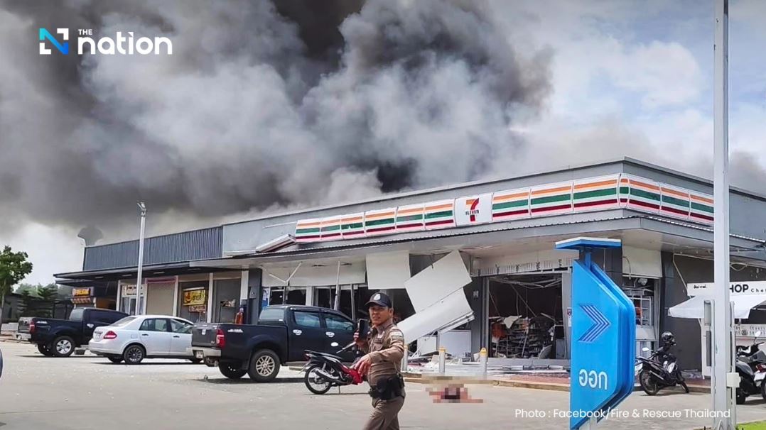 泰国消防员在四色菊府一家便利店内发现两具学生遗体,不远处的加油站似乎遭到了炮击,发生大火后冒出滚滚浓烟。(图:民族报)