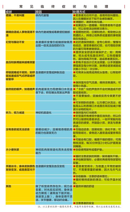 • 临终者嗜睡或昏迷时听觉仍存在,可说“会听你的交代”、“没关系放心地走”、“我爱你”等话语。