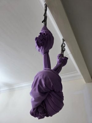 后来,我发现家附近的瑜伽馆开设空中瑜伽课(Aerial Yoga)。上了3个月,我忍不住上网淘了一款紫色吊床。趁着装修师傅登门,我便指示他在客厅的横梁上安装吊钩。几分钟的工夫,我实现了在家中练习空瑜的梦想。课堂上学的几个简单招数,我都能在家练习,只是某些繁琐的步骤没办法记牢,大腿内侧也因缠布而隐隐作痛。一年后,我因腰部旧患复发而暂停学习空瑜。
