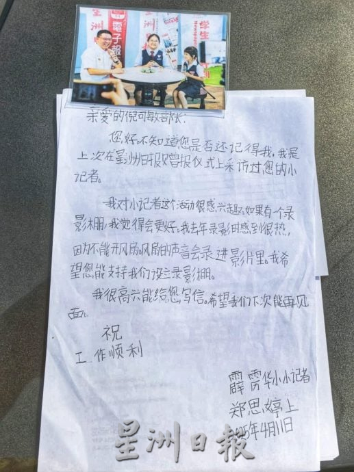 回去后第二天,“申请信”就写好了,交给老师帮忙修改。信中写道:“亲爱的倪可敏部长,不知道您是否还记得我,我是上次在星洲日报赠报仪式上采访过您的小记者。我对小记者这个活动很感兴趣。如果有一个录影棚,我觉得会更好。我去年录影时感到很热,因为不能开风扇。风扇的声音会录进影片里。我希望您能支持我们设立录影棚。我很高兴能给您写信。希望我们下次能再见面。祝工作顺利。”