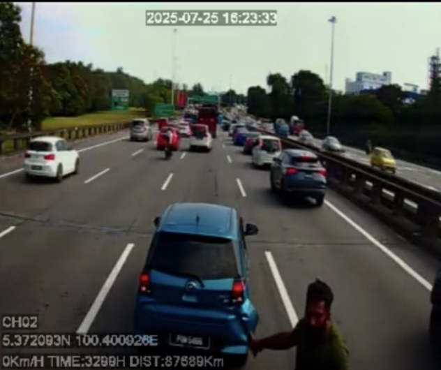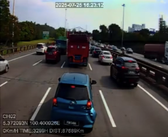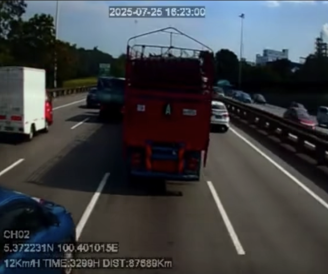 (八打灵再也28日讯)鲁莽变道酿祸!一辆轿车突然从左侧硬插入两辆大型罗里之间,仅短短5秒便遭撞上尾部,所幸罗里及时刹车,没有酿成严重事故。