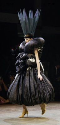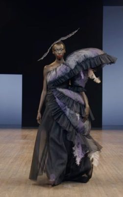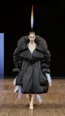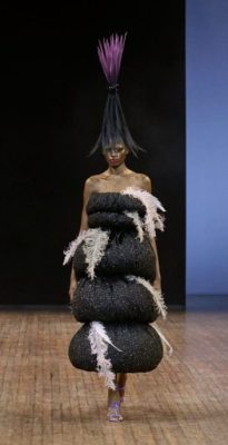 看了Schiaparelli再看Viktor&Rolf,会觉得两者在大唱反调,Viktor&Rolf系列作品都以像似打满气的泡泡礼服上场,再搭配格外炫目的羽毛作点缀。更在社交平台IG上介绍这个系列时表示,这系列是“Angry Bird”,更言愤怒鸟将挣开束缚奔向自由。