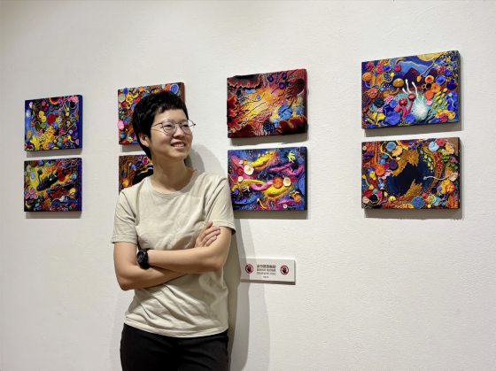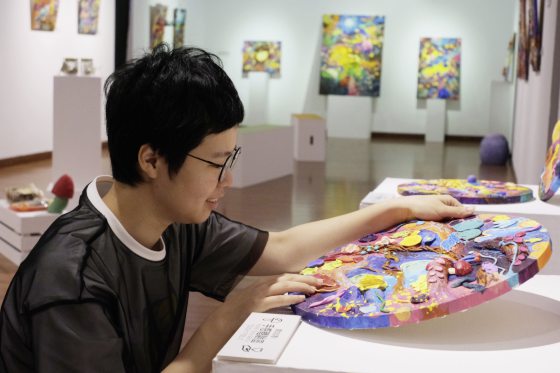 《蘑幻嘉年华》也特别开放部分画作供观众触摸,让艺术体验延伸至感官层次。俞云冰认为艺术不仅属于眼睛,更是全身心的对话。