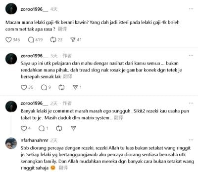 男子在帖文中问道,“那些月薪4000令吉或更低的男人,你们怎么还敢结婚啊?”