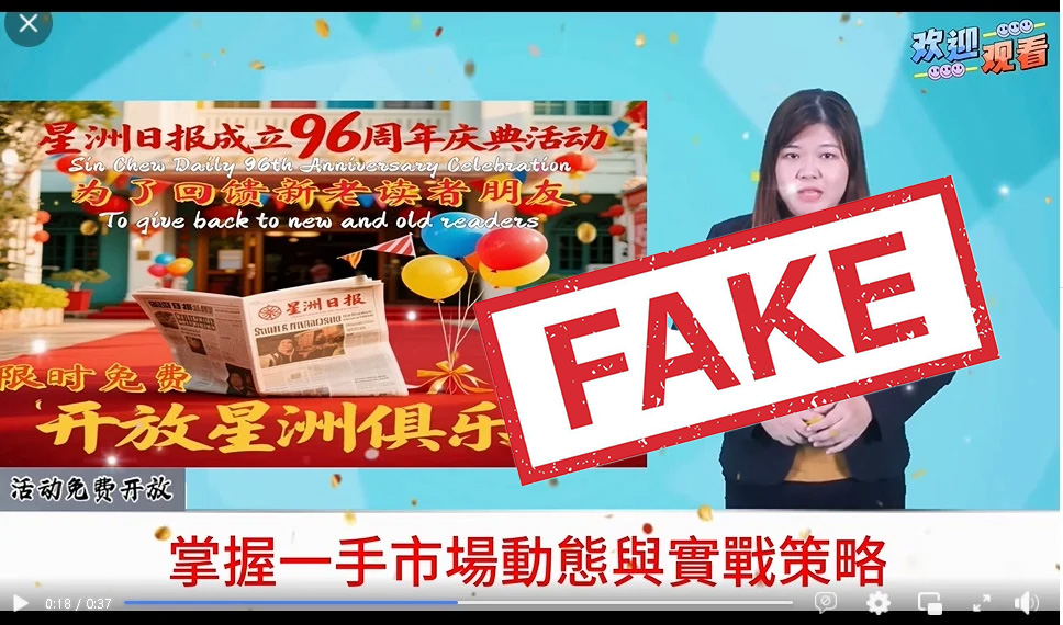 该脸书专页名为“星洲财经快讯”,利用本报主播播报新闻的视频,伪造涉及诈骗内容的视频,要求读者加入“星洲俱乐部”,以获得“独家股票投资课程”。