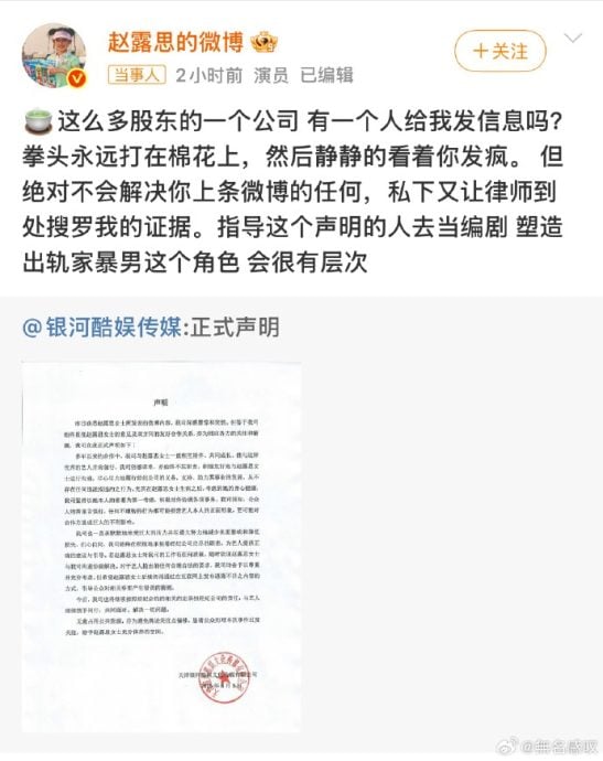 (北京3日讯)赵露思与经纪公司银河酷娱的合约争议持续发酵,继她昨晚发长文控诉公司在她病倒期间划走205万人民币(约121万令吉,下同)赔偿剧组、拒绝协商、甚至威胁封杀后,今日公司发出声明澄清未违法违约。声明发出不到10分钟,赵露思火速转发用“绿茶”表情符号反击,并疯狂留言怒批公司冷处理、恶意中伤,更爆料对方曾到处声称“她装病”。