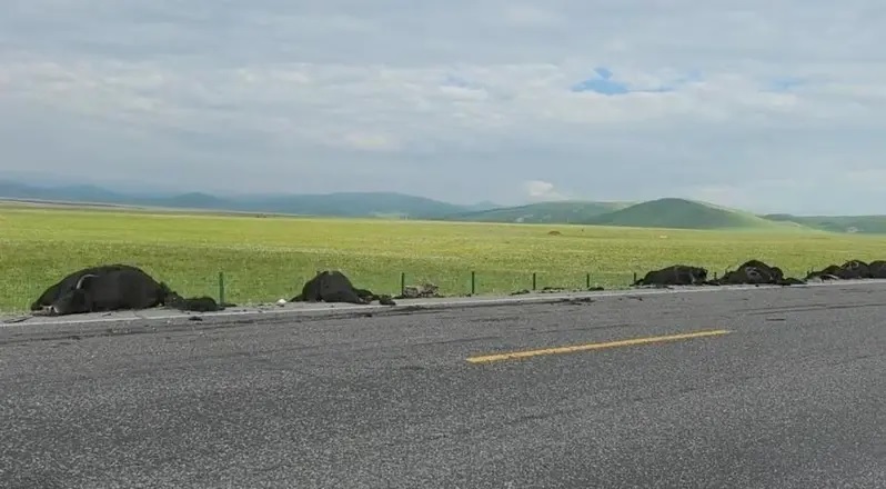 陆媒极目新闻报,甘肃甘南州尕海镇近日有网友发布视频表示,“撞了这么多头牦牛,得赔多少钱哦,大货车车头都变形了……”视频中,有多头牦牛躺在路边,远处停著一辆大货车。