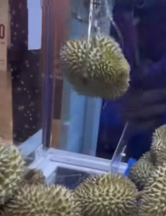 (曼谷4日综合电)在泰国,夹娃娃机不再只是用来抓娃娃或玩具,现在连榴梿也能夹!