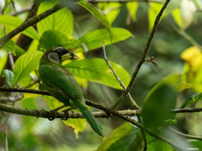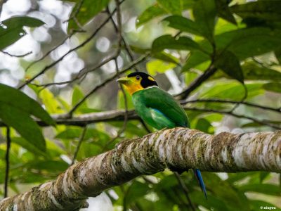 这波鸟浪很快来了一只样子滑稽可爱的长尾阔嘴鸟(long-tailed broadbill),它黄色的头颅仿佛戴了顶黑色假发,就日本搞笑节目里常看见的那种,扁平如马克笔涂彩,加上一脸专注表情就更反差萌了。它在相当靠近我们的树桠上抹嘴巴,斐笑它跟我一样特别爱现,枝桠间飞飞停停,多角度让我们拍照。 接着是一只大青鸟,火簇拟啄木(fire-tufted barbet),粗壮的喙与额头之间长出长长的毛,尾端呈橘红色,“火簇”顾名思义。