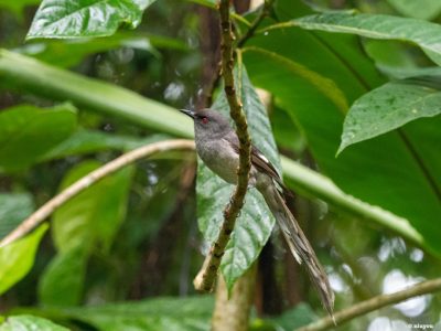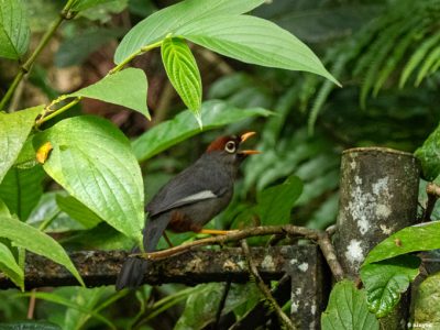 最后回到溪流处,几只栗头噪鹛(chestnut-capped laughingthrush)就在眼前觅食,它们像是画了白眼圈的小丑,刻意笨拙地在低处现身,是这趟旅行最常见的明星鸟。尾随着噪鹛的是几只长尾奇鹛,也许就是不久前才在Singapore House见到的那几只,特意降到了几乎让人唾手可及的高度,我才终于看清了它的红眼睛,但很快,它们又窜入树冠,叽叽喳喳聊天去了。
