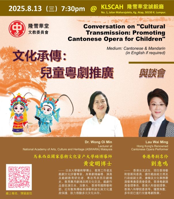 隆雪华堂文教委员会将于2025年8月13日(周三)下午7时30分,在隆雪华堂诚毅厅举办“文化承传:儿童粤剧推广”中粤双语与谈会,免费入场,欢迎公众参与。