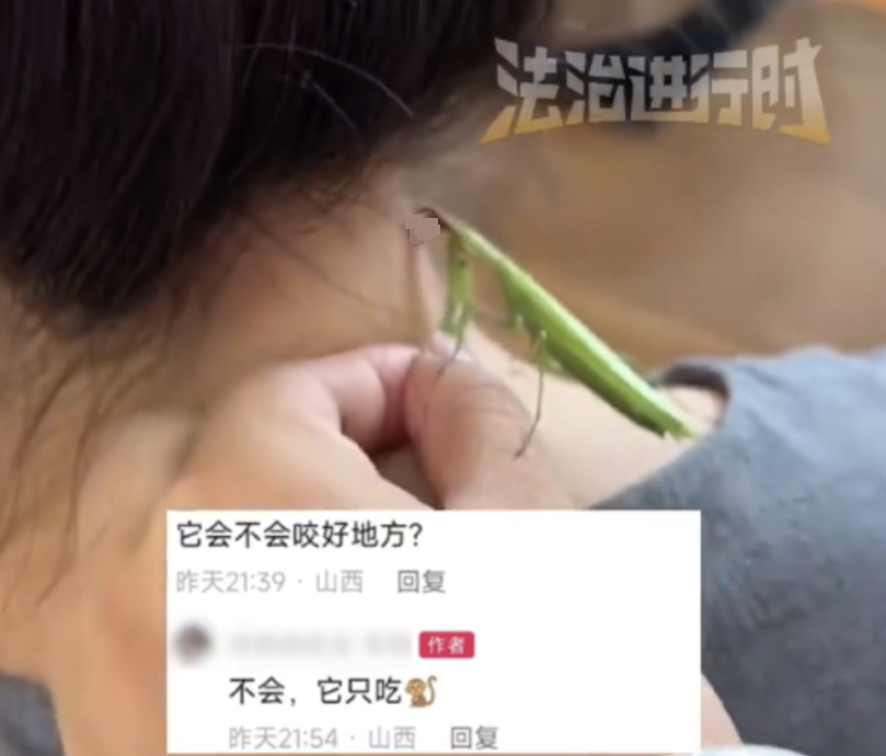 报道指出,女子事后也在评论区回应称,在被螳螂啃咬的过程中“有一点疼,像针扎一样”。
