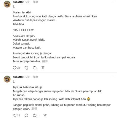 据称最后一晚更是离奇,当时两人在卧室聊天至深夜时,突然听到疑似男性怒吼声,声音极近,像是来自床角。他转头发现妻子已将被子拉过头顶,没有作声。不久后,浴室又传出疑似女性说话声。