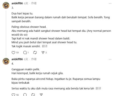 几天后,他声称又遇到更多异常——沙发、垃圾桶等物品位置被移动,浴室花洒头从原位掉入水桶中,而某天回家时,发现冷气、灯及风扇全数开启,尽管早上出门前已关闭。