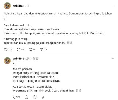 (八打灵再也11日讯)一名男子在社交媒体分享一段奇异经历,声称他与妻子新婚时暂住友人公寓期间,经历一系列难以解释的情况,令两人感到不安,仅住一周便搬离。不过,男子离奇的说法还是让不少网民感到怀疑。