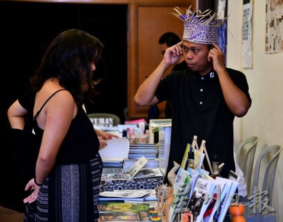 不远处,色迈族青年Bah Saluji戴着象征原住民身分的帽子,一遍遍向止步在摊位前的人介绍自己是谁。“以前,在治疗仪式上,我们会戴上这个帽子弹奏乐器,脸颊还画有花纹。”