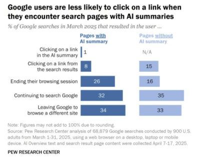 皮尤研究中心早前分析了900名用户在2025年3月的浏览数据,发现AI摘要诞生后,用户点击网站的比例已从15%降至8%。即使AI摘要附有网站链接,点击率也仅仅为1%。