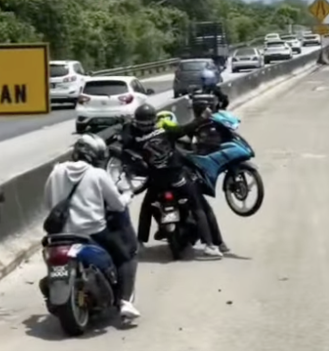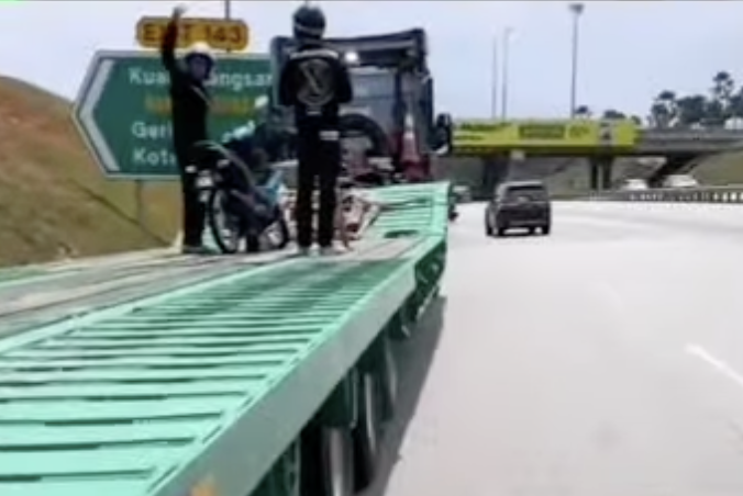 现场视频显示,两名骑士沿着高速路肩缓慢前行,后座乘客紧紧抱着一辆相信已抛锚的摩托车,车辆在一旁呼啸而过,场面既危险又引人注目。