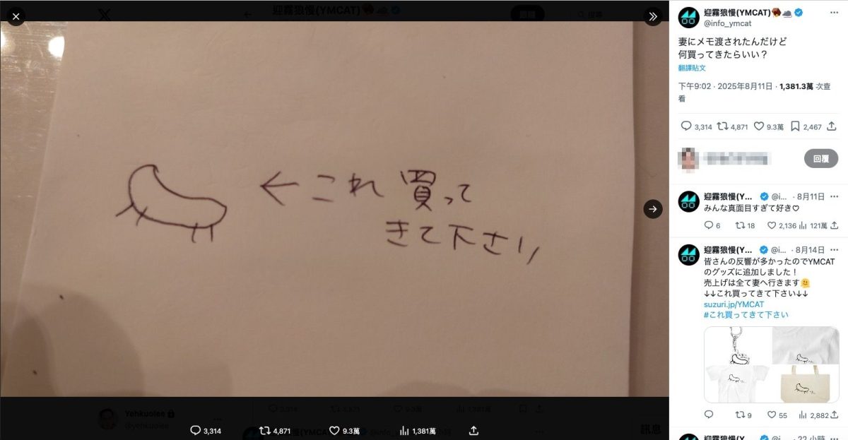 迎雾狼慢(YMCAT)妻子画的代购物品引起网友讨论。(图:互联网)