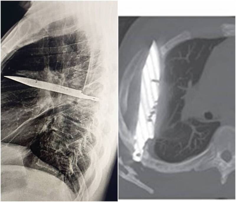 综合外媒报道,这名44岁男子因为乳头流脓而到医院就诊,医生初步检查发现男子并无胸痛、呼吸困难、咳嗽,生命体征也都在正常值,让医疗团队非常困惑,不过在照过X光后,发现有一把刀从男子右肩胛骨插入,停留在胸腔中,男子才想起来