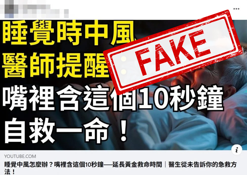 网传上述说法,指睡觉中风含糖果或盐可延长黄金救命时间,还称是“医生从未告诉你的急救方法”,对此台湾事实查核网站MyGoPen咨询台湾振兴医院心脏血管内科医生陈冠群,证实传言错误。