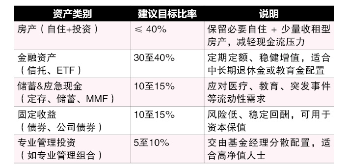 为避免财务过度依赖房产,建议将资产配置逐步调整为以下目标结构: