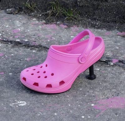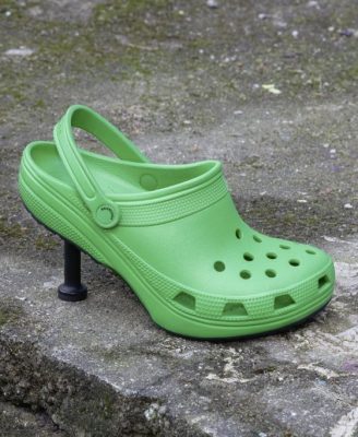 还有与大家熟悉的“洞洞鞋”Crocs跨界合作推出高跟鞋款,呈现的方式更让人觉得有点简单粗暴,就是直接在彩色的“洞洞鞋”鞋跟,加上了一根数英寸高的鞋跟,不带半点修饰,有点儿戏得来又有趣得紧。后期双方还合作了一款厚底“洞洞鞋”,还附上了装饰、登上了时装秀的伸展台,或许也就间接启发了Crocs,后来也在自家的款式里加入了厚底鞋款。