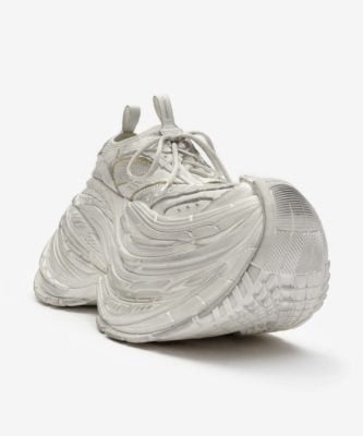 另外,还有明明是全新但就是看起来脏脏的鞋,如新一季和运动品牌Puma联名,却刻意将运动鞋以破损的方式呈现。这些单品都让Balenciaga成了百分百的“显眼包”,每一次上架都充满了活题,也一直让品牌的热度保温。人们对它的出品固然有褒有贬,但是不论褒贬,让你一直无法忽视它,甚至期待它下一季又会有什么搞怪的新品上架,就冲这一点,品牌便已经达到目的了。