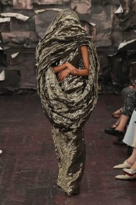 两个幽灵般的人物披着斗篷,裹着面纱的垂坠针织连衣裙,犹如从哥特式教堂雕像中幻化而出,紧贴身体又不失其自身形态的针织垂坠礼服暗示着某种黑暗和怪诞的东西,寒意袭来,无疑是一场令人不安的对峙,与潜伏在我们时代的死亡预兆形成鲜明对比。这些奇迹般构造的、如同坟墓般的裹尸布之下,结构奇特的紧身胸衣,臀部凸起,前部则像胸衣一样隆起。军绿色蜡染礼服,上面戴着一个饰有繁复串珠的黑色面罩,仿佛又是一种世纪末的警告。