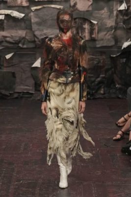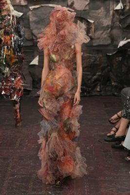 开场的first look造型包裹着透明塑料的雕刻长裙,伴随着 The Smashing Pumpkins 的摇滚民谣〈Disarm〉展开,据说这是借鉴了吹制玻璃的工艺及呼应Margiela先生设计的干洗系列为灵感,回收物料的梦幻结构,同时在皇家艺术学院学位展上展示的造型相似,塑料包裹的款式更随后多次出现。接下来相继出场的设计和造型开始着手打造一个三分之一由升级再造材料制成的系列,运用纸张、影印件、手绘、废旧珠宝以及用锡盘打成的面具,时而女性化时又见男性化,这androgynous的雌雄同体,优雅地平衡了品牌既定的审美及无损设计师自己独有的标志性风格。