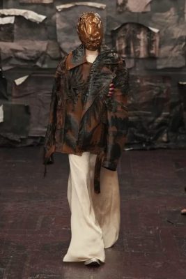 秀场选址充满象征意义,于巴黎Curial街二号的Le Centquatre文化空间举行,而这里正是本人在2008年发表最后一场秀的地点,誓向品牌创始人致敬及为新篇章定下基调。自称为“Margiela之子”及出身于工业设计背景Glenn Martens,与 Margiela一样来自比利时,而那种朴素的氛围与他息息相关,同时将那哥特式的忧郁浪漫融入设计及秀场上。场地布置将作品与一栋房屋联系起来,和简约主义大唱反调。从17世纪Flemish压花皮革壁纸腐朽表面与Margiela在其首个系列中使用的彩绘和拼贴技法息息相关。此外,古董窗帘、荷兰花卉和“nature morte自然静物”等富有腐朽质感的元素,刻意制造和笼罩一种令人敬畏的美感;而这些元素或许在当时的家居中随处可见,在铺满层层剥落壁纸的地下室里,一群戴着精心制作面具的人像令人联想到哥特式雕塑,以及奇特、复古、拼凑的表面,仿佛是从墙壁里冒出来的。这一种象征性奇特而又独具特色的呈现方式,充满诗意的意象从中世纪历史的阴暗角落升起,既怀旧又未来的Margiela式幻境为品牌升级改造和再利用的根基赋予了新的、破碎的光泽。