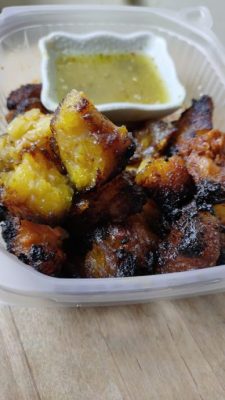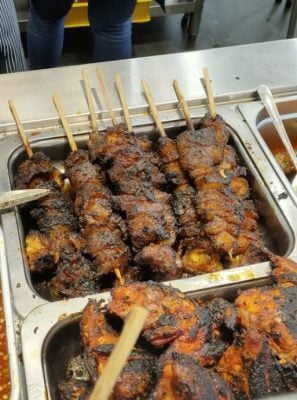 巨无霸牛油渣不会一整串上桌,而是先用剪刀剪成小块,再和一小碗酸甜咸辣的蘸酱(air asam)一起送到桌上。