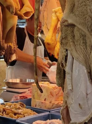 吉隆坡秋杰巴刹牛肉摊上,一大块白色方形的牛肥膘。