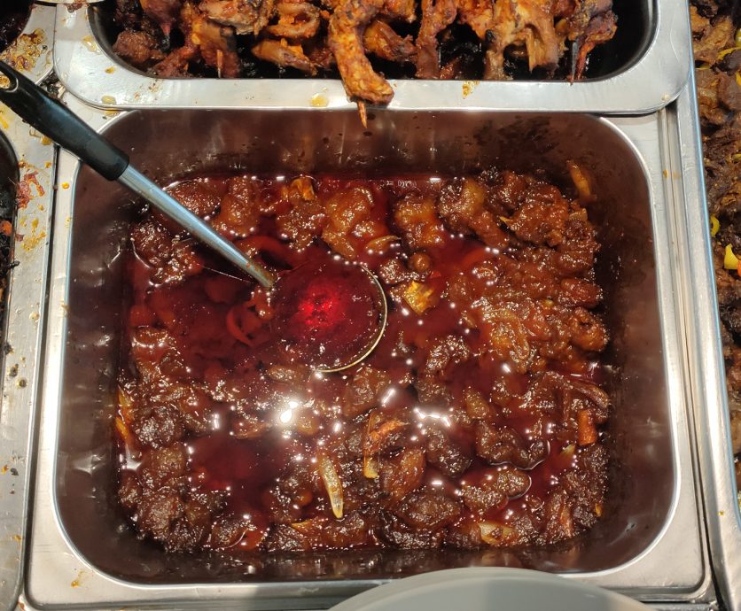 以蚝油、番茄酱、辣椒酱等调味料煮成的酱炒牛肥膘(Lemak goreng belengas),油光浮动,香气四溢。