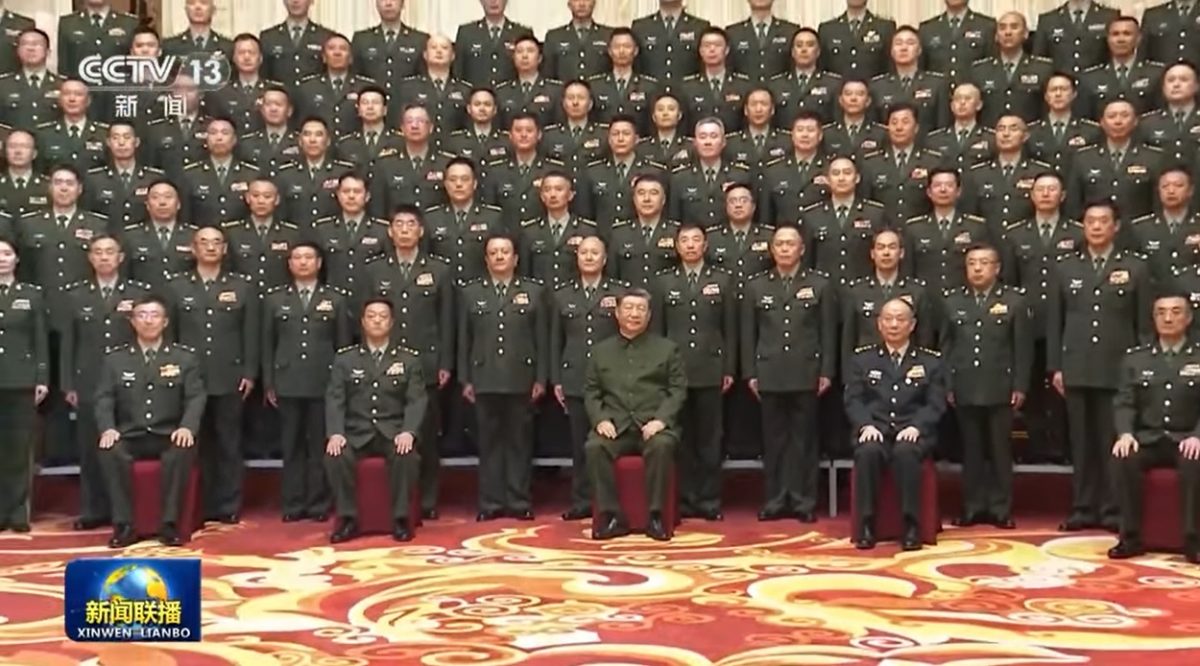 画面中,坐在习近平右边的是西藏军区政委袁红刚,左边为中央军委委员、军委纪律检查委员会书记张升民。