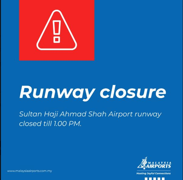 大马机场控股公司今早在社交媒体发文说,大马民航局已就此事发布飞行通告,预计关闭该机场跑道至下午1时。