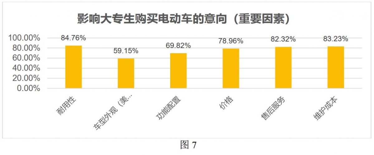 在决定是否购车的因素上,高达84.76%的大专生认为“耐用性”是最关键的考量,其次是维护成本(83.23%)与售后服务(82.32%)。