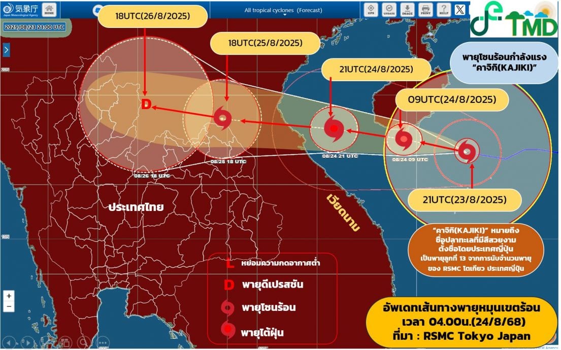 泰媒Thaiger引述泰国气象预报指出,“剑鱼”可能在25至26日登陆越南及寮国北部,将导致泰国多地出现大雨至豪雨,东北部及北部地区24至27日也会出现强风。