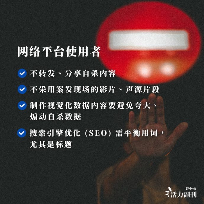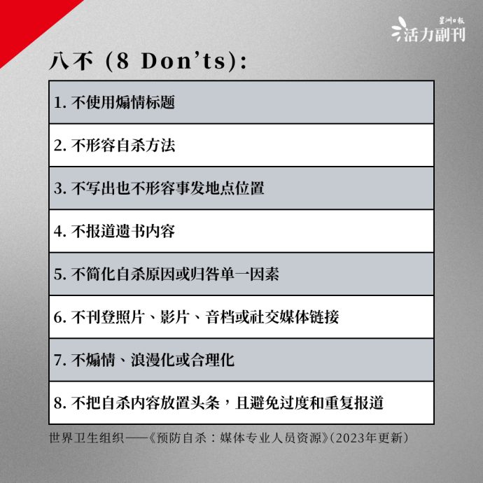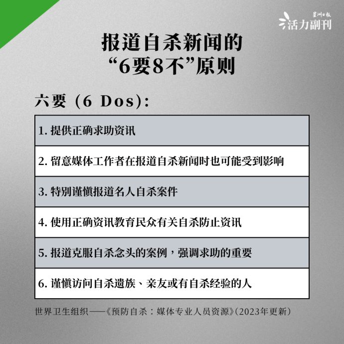 面对这种网络乱象,副刊迅速翻出去年尾的《自杀事件应对》专题,整理成图文再次发布。报道提到,世界卫生组织(WHO)对于自杀新闻有“六要八不”指南,包括不使用煽情标题、不描述自杀方法、不报道遗书内容;针对网络使用者,也建议不转发或分享自杀内容,不使用案发现场影片或声源片段,并避免夸大视觉化数据内容等等。但指南归指南,为了流量,很多人还是无所不用其极。