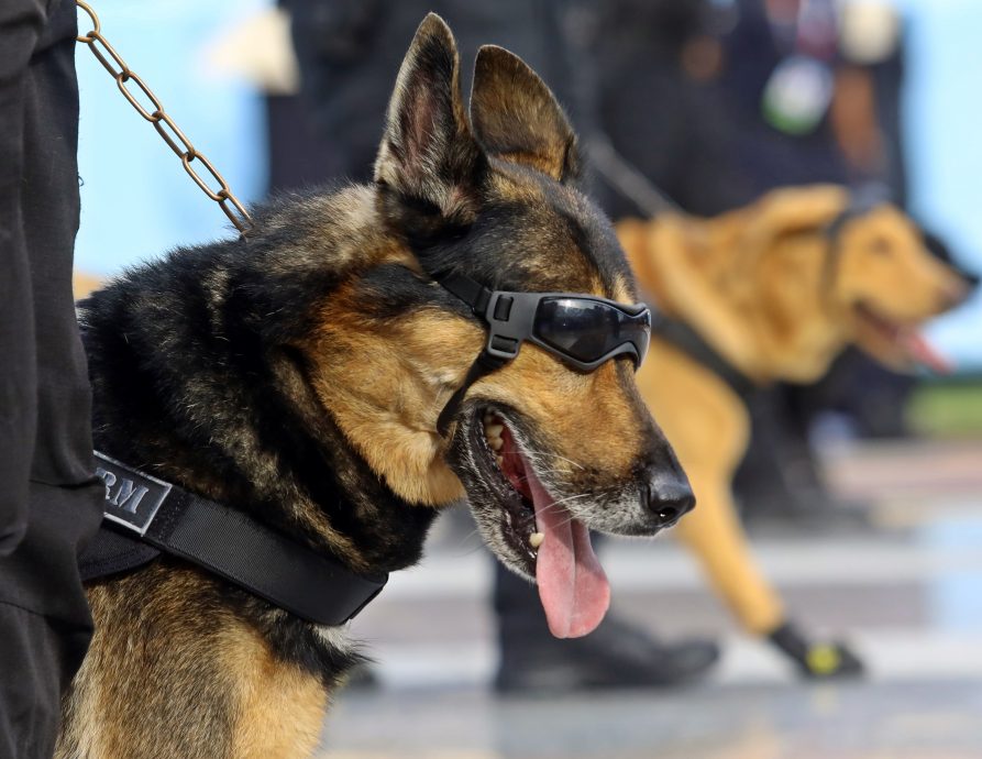 戴上墨镜出列的警犬,酷劲十足。(蔡伟传摄)