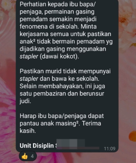有一名家长在评论区留言说,其孩子就读的学校已经发出警告,提醒家长们不要让孩子带订书钉来学校,指这游戏不仅危险,而且是一种浪费和含有赌博的元素。