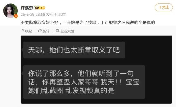 许荔莎的直播内容引发热议,她也再度发文表示:“不要断章取义好不好,一开始是为了整蛊,于正报警之后我说的全是真的,一分钱没收,也不会收,之后说的话不是开玩笑也不是整蛊,许凯粉丝别洗了。”对于这起“退群”为导火线,“整蛊”为爆料理由的事件,让吃瓜的网民都忍不住直言:“娱乐圈的好戏看多了,但这一次,该让法律出来结局了。”